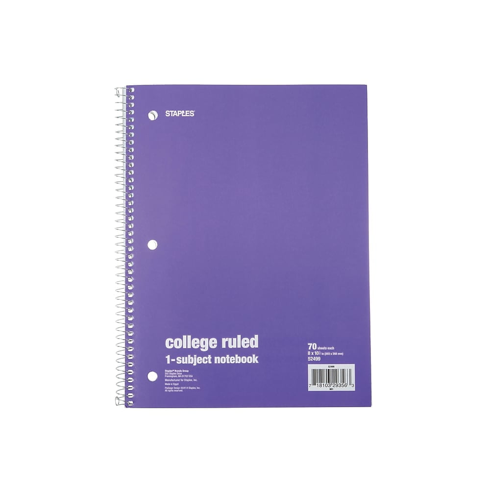 Staples 1 Subject Notebook Spiral Bound 8 In X 10 47 In 70 Sheets 140 Pages College 3 Holes Available In Different Colors Walmart Com